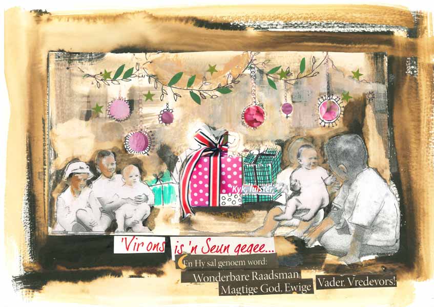 Al het ons seker eers twee-uur in die bed gekom, het ons wakker geskrik toe Ma die volgende oggend saggies vir Pa kombuis toe roep. Ons het bly lê totdat hulle vir Ouma en Oupa gaan haal het en toe het ons op ons tone in die gang af geloop en by die middeldeur gaan staan en Die Heiland is gebore gesing.